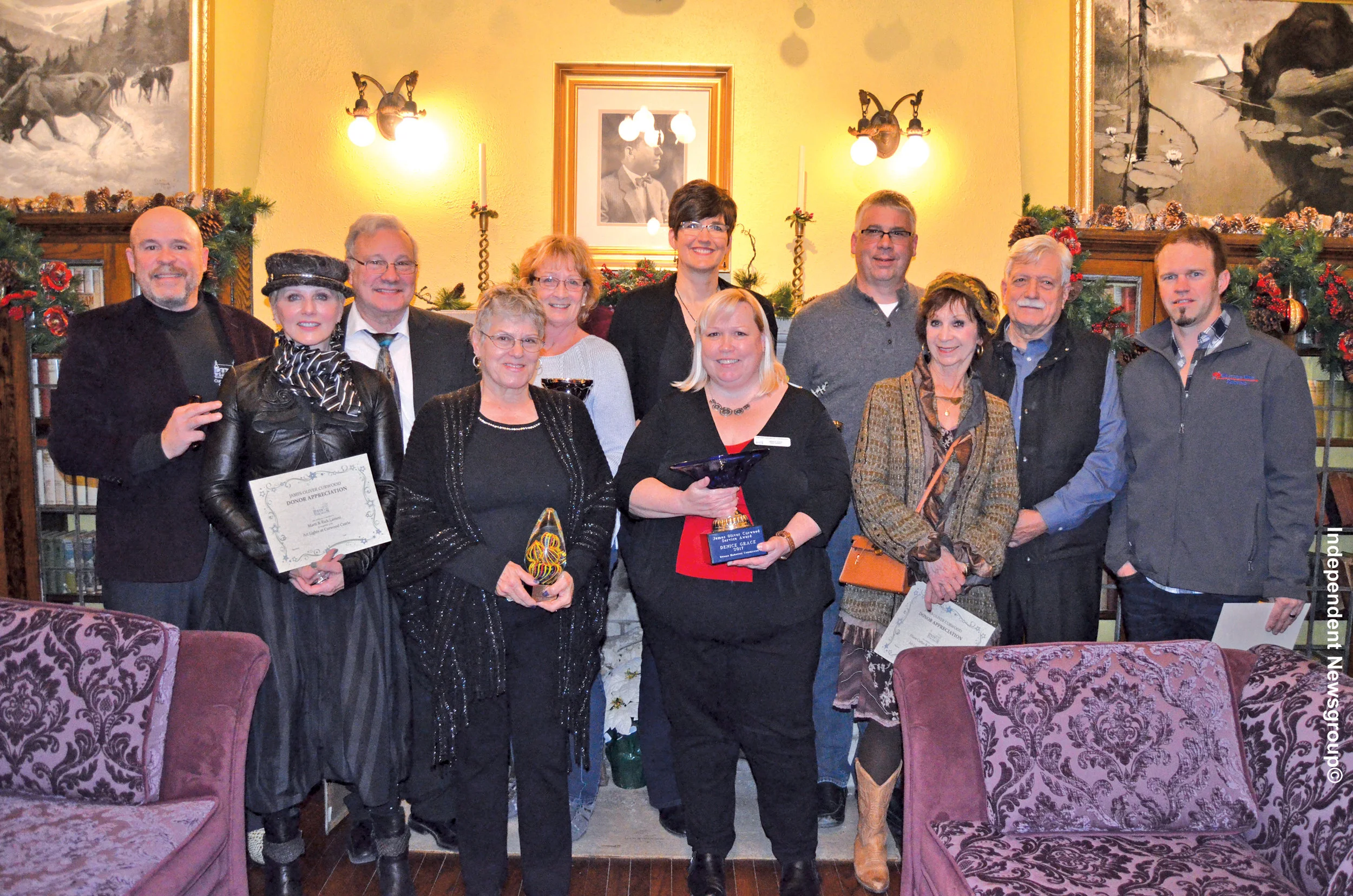 Owosso Historical Commission 2017 Volunteer and Donor Recognition Award Winners, left to right: Robert Doran, Executive Director; Marti Lameti & Rick Lameti, Donor Appreciation Award for Castle Art Lights; Elaine Greenway, Director's Award; Linda Thorsby, Volunteer of the Year Award; Denice Grace, James Oliver Curwood Service Award; Sue Ludington & Carl Ludington, Volunteer of the Year Award; Diane Cutler and Dr. Dan Williams, Donor Appreciation Award for Castle Art Lights; Kris Poag of Weather Vane Roofing, Donor Appreciation Award for new roof on Paymaster Building.
